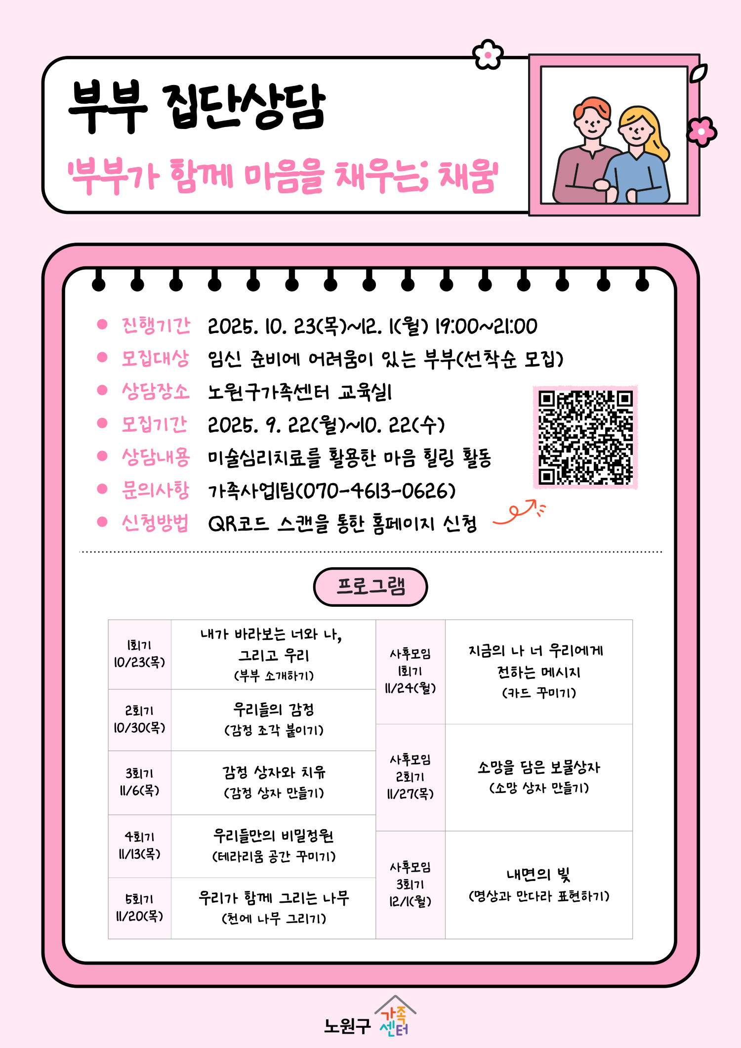- 상담장소: 노원구가족센터 교육실1(동일로173가길 94, 3층)